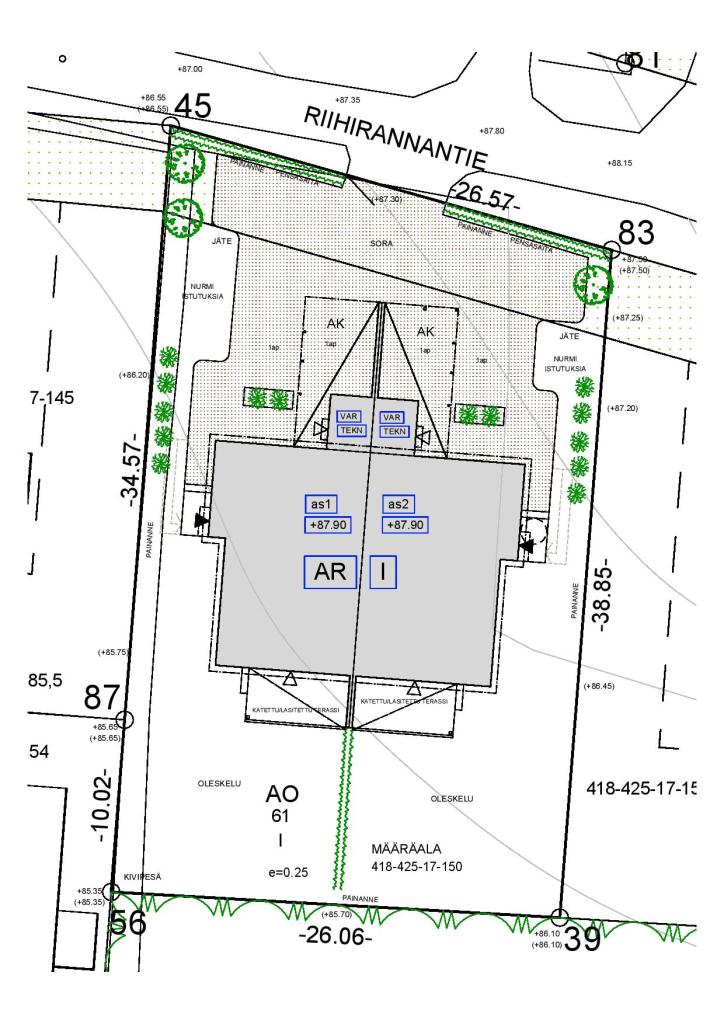 Puistoalueeseen rajoittuvalle tontille rakennetaan yksitasoinen laadukas paritalo, jonka huoneistot ovat kooltaan 77 m2 ja huonejakaumaltaan 3h+k+s.